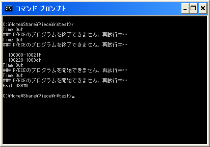 srfファイルが在るフォルダで、「r」を実行すると、srfファイルをP/ECEに転送し実行します。srfファイル名の指定は不要です。