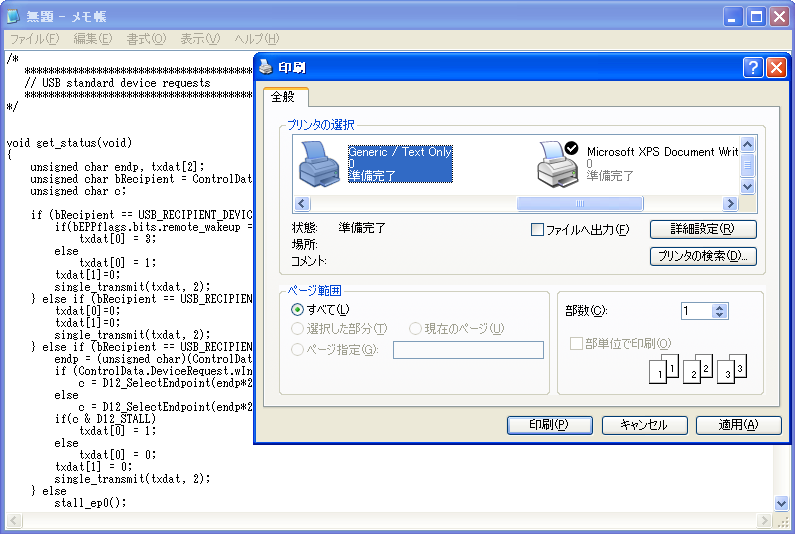 Windowsからは、P/ECEがUSB印刷サポートとして認識され、「Generic / Text Only」プリンタに見えます。