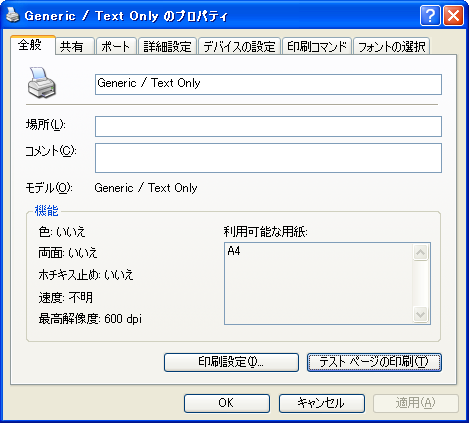 「Generic / Text Only」を右クリックして、「プリンターのプロパティ」⇒「テストページの印刷」を実行してください。